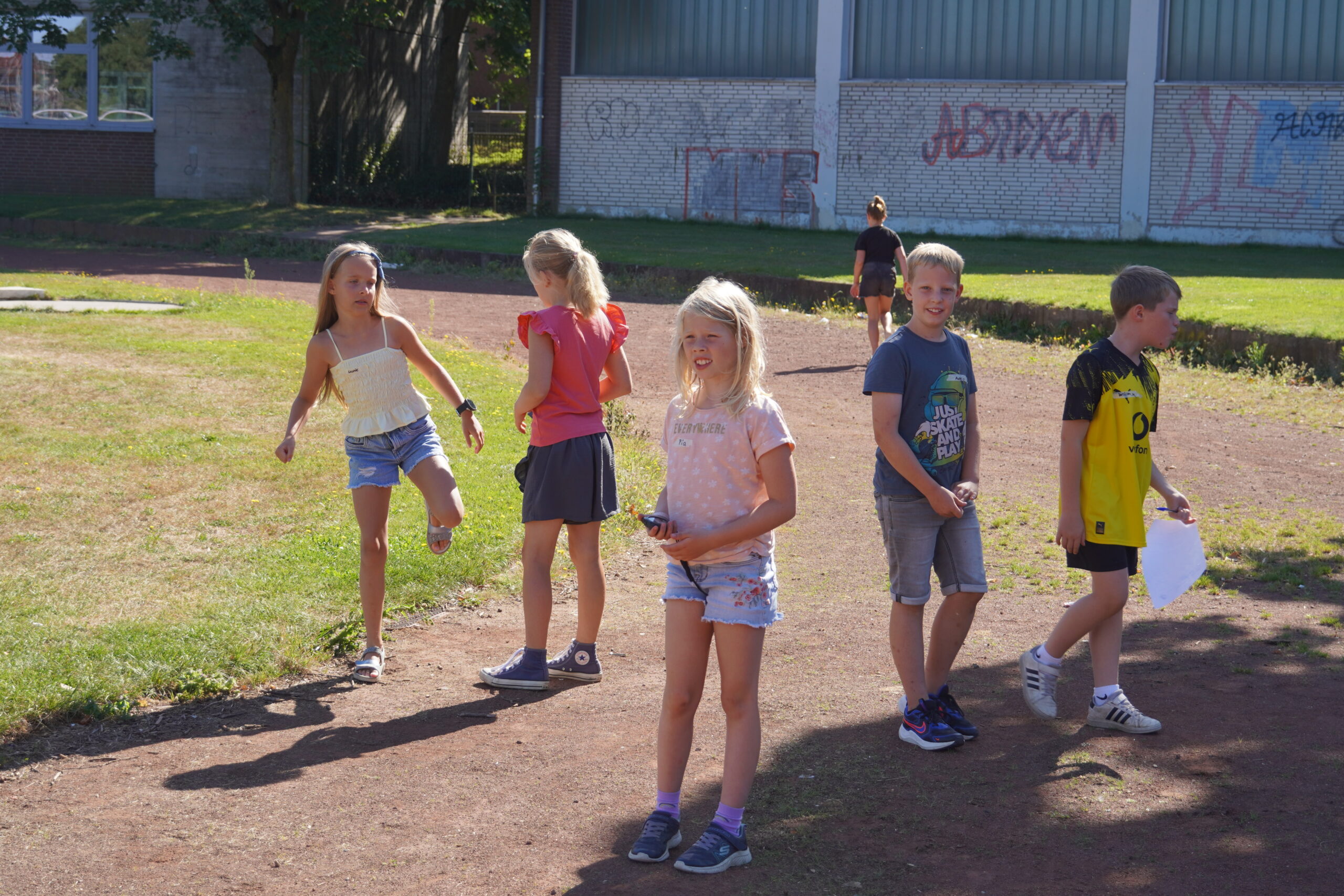 Danach wurde es lebendig: Im Innenhof wurden die Neuankömmlinge von Anton, Justus, Juna und Hilda aus der 6c erwartet. Die Vier konnten sich noch gut an ihre Einschulung im letzten Jahr erinnern und sprachen den Kindern Mut und Zuversicht zu.