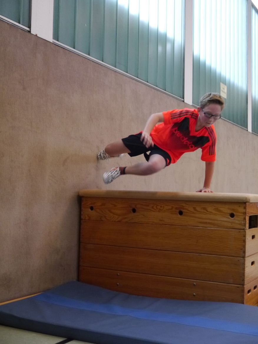 Auch die körperliche Auslastung trägt zu gesunden Schülern und somit zur gesunden Schule bei. Deshalb besteht der zweite Teil des Projektes aus einem Parcours, der mit den speziellen Parcourstechniken durchlaufen werden muss. Kästen werden übersprungen, die Wand als Trittbrett benutzt, es wird sich geschickt abgerollt und durchgeschwungen. Wie richtige Actionhelden meistern die Schülerinnen und Schüler diese ungewohnte körperliche Herausforderung, die von der Kölner Organisation Maropro unter dem Namen „Milchparkour“ angeboten wird.
